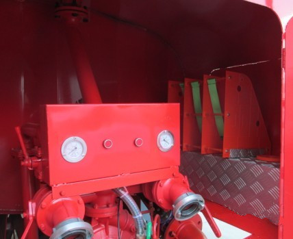 3. 該車配置有消防泵、消防炮、全功率取力器。罐體后帶工作平臺,平臺上安裝綠化灑水炮,灑水炮可全方位旋轉,帶前沖后灑,帶側噴,可連續調成直流狀、霧狀、大雨、小雨、毛毛雨,帶安全護欄;罐體頂部安裝消防水炮;帶消防接口,可通過消防栓進水,帶自流閥,消防綠化卷盤;